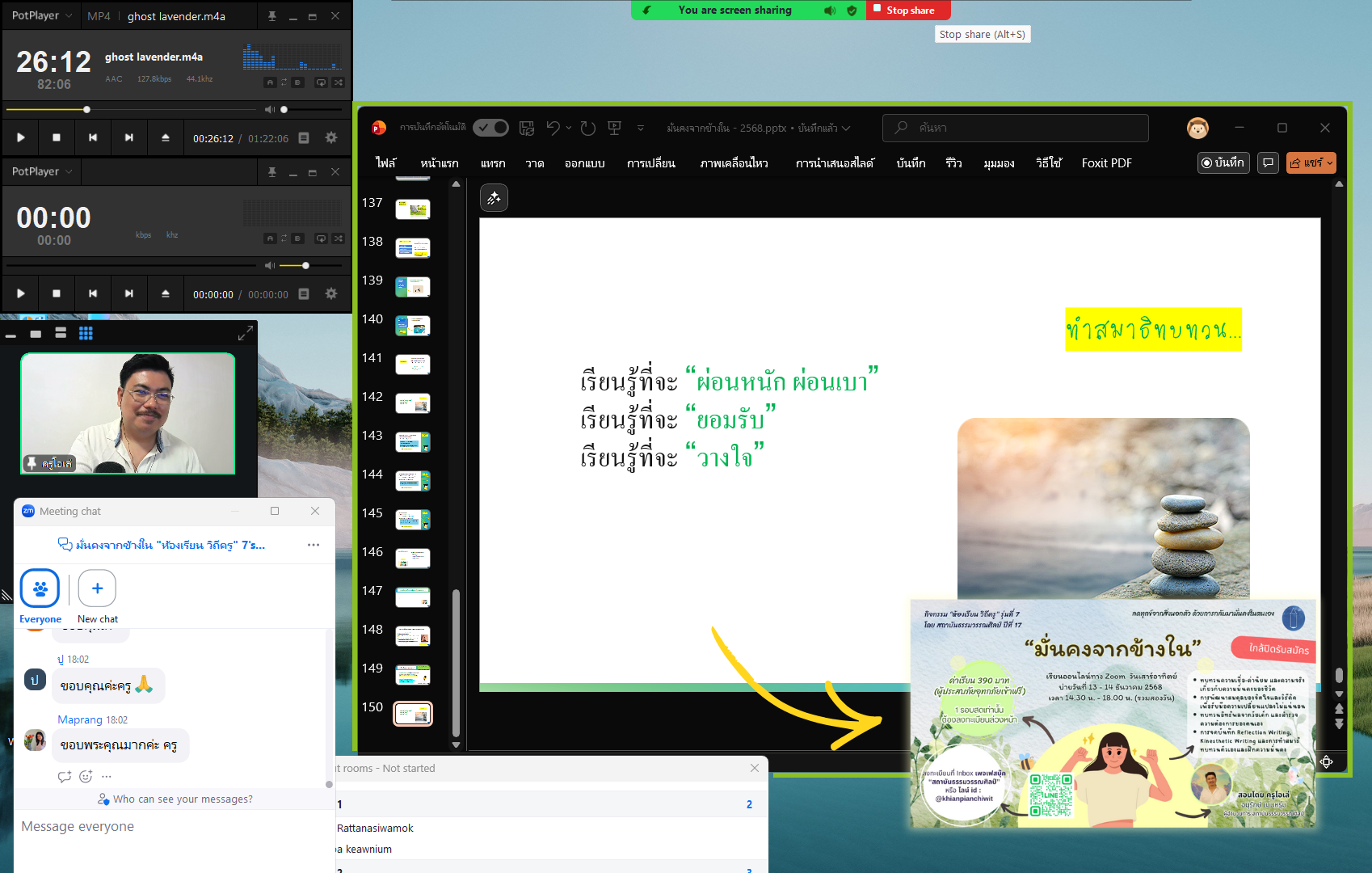 จบลงหัวข้อที่ 3 ของการอบรม “ห้องเรียน วิถีครู” รุ่นที่ 7 ออนไลน์ในเนื้อหา “มั่นคงจากข้างใน” เมื่อบ่ายวันที่ 13 – 14 ธันวาคม 2568 ขอบคุณผู้เรียนทั้ง 23 คนที่ได้ร่วมกิจกรรมและแลกเปลี่ยนกันในครั้งนี้