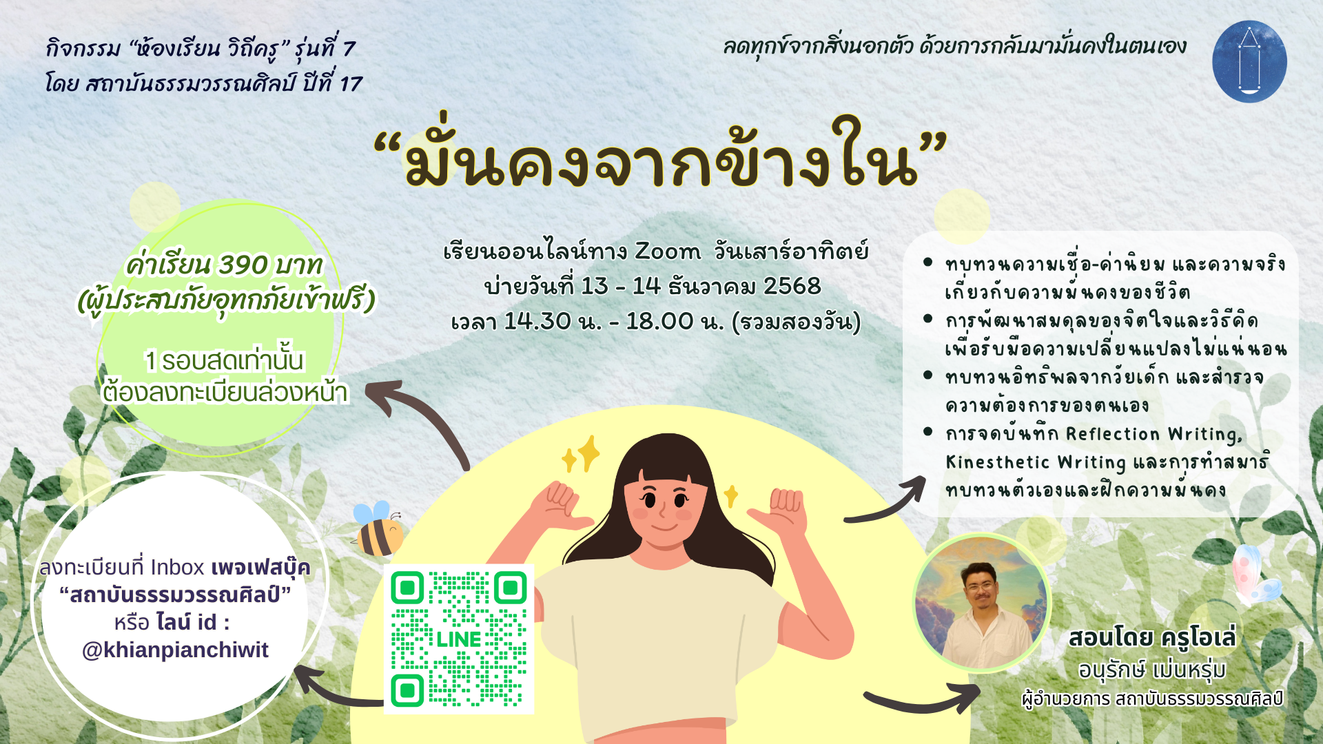 ลดทุกข์จากสิ่งนอกตัว ด้วยการกลับมามั่นคงในตนเอง กิจกรรม “ห้องเรียน วิถีครู” รุ่นที่ 7 – บ่มเพาะครูภายในตน เรียนทักษะสำคัญเพื่อเป็นที่พึ่งแก่ตัวเองและผู้อื่น (เข้าเรียนได้ทุกอาชีพ)