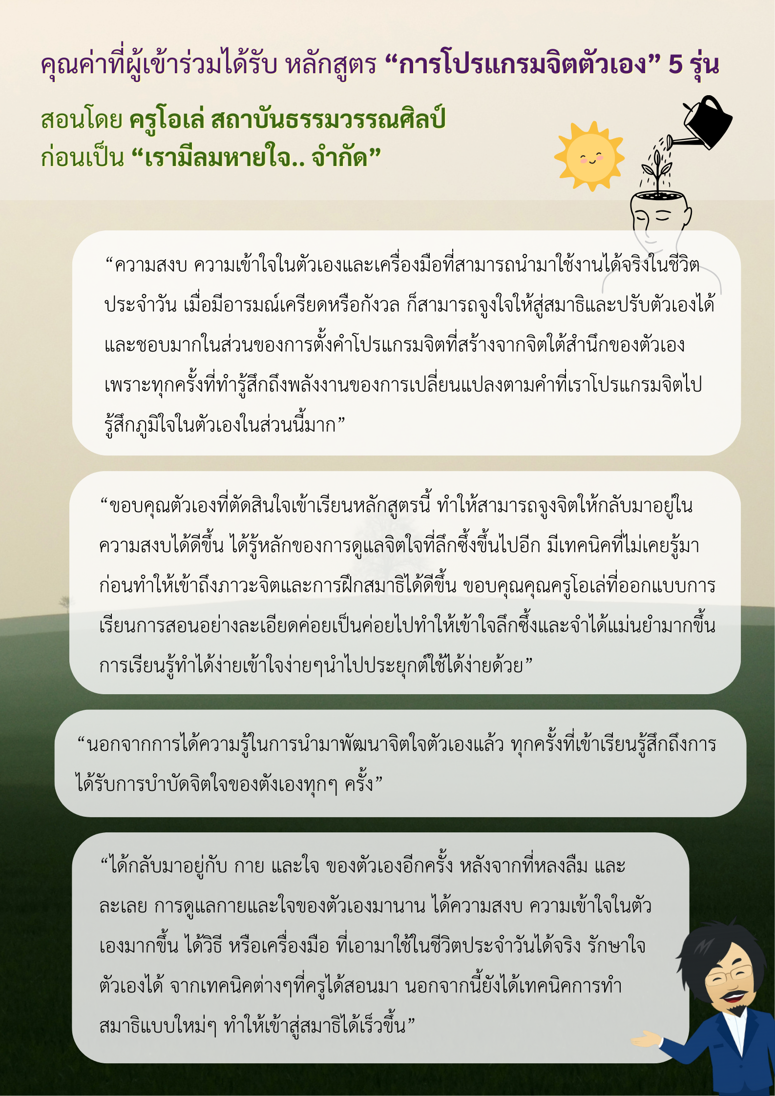 ในค่าเรียนตามบริจาคจนถึงหลักร้อยและหลักพันต้นๆ ในการส่งมอบคุณค่าของการรู้จักตน รู้จักชีวิต การพัฒนาโลกด้านใน และการตระหนักถึง “เรามีลมหายใจ.. จำกัด”