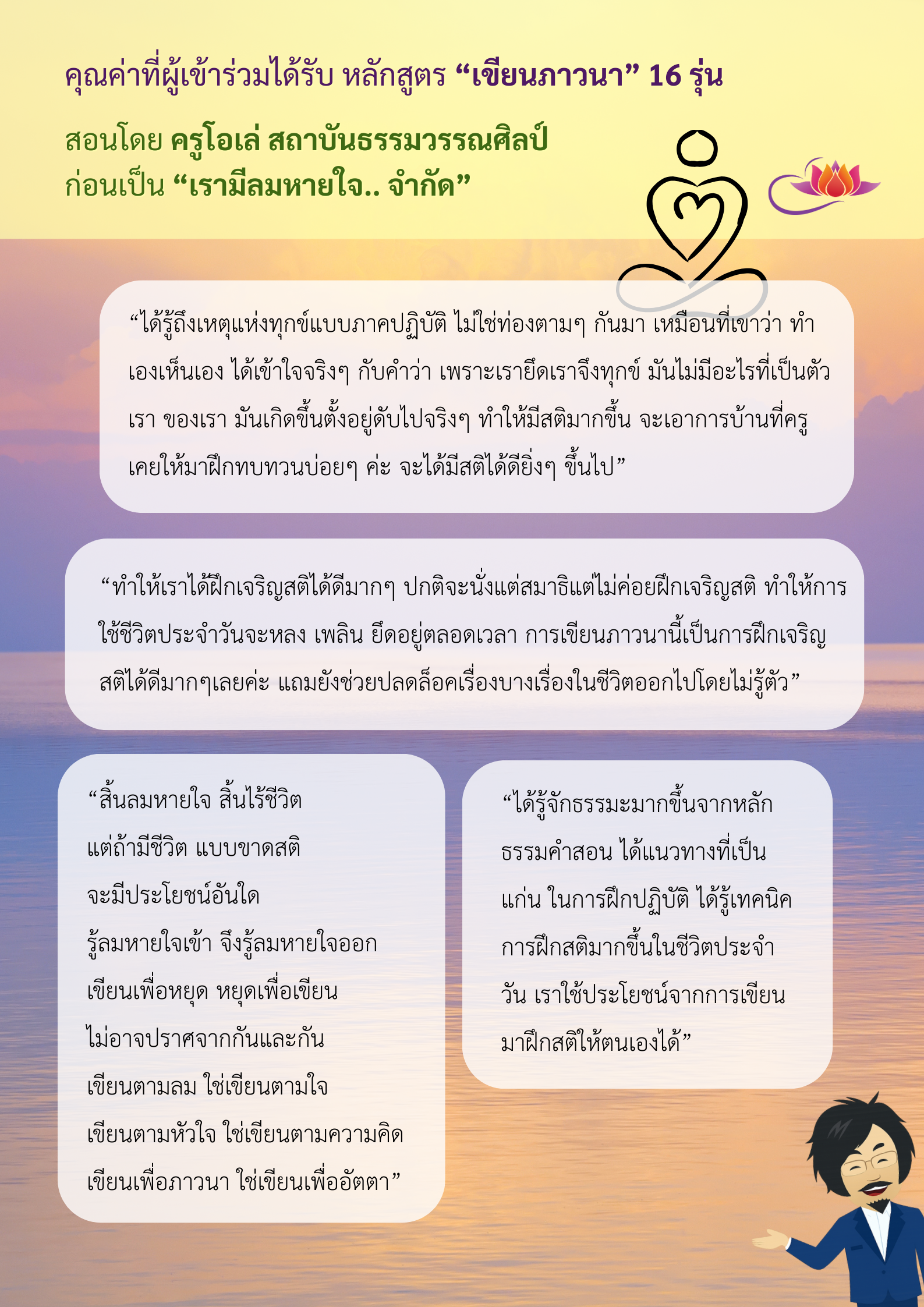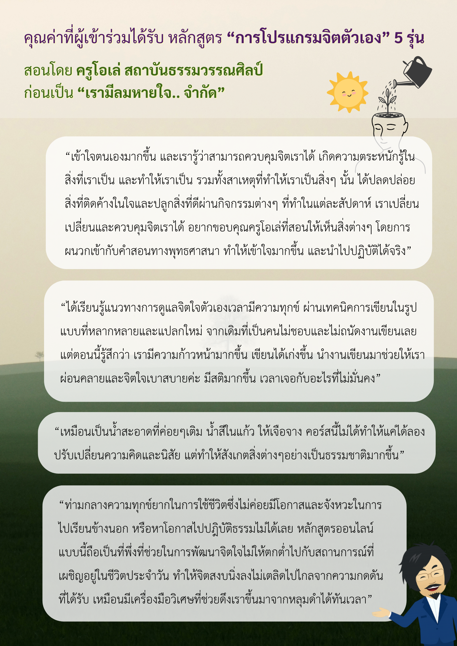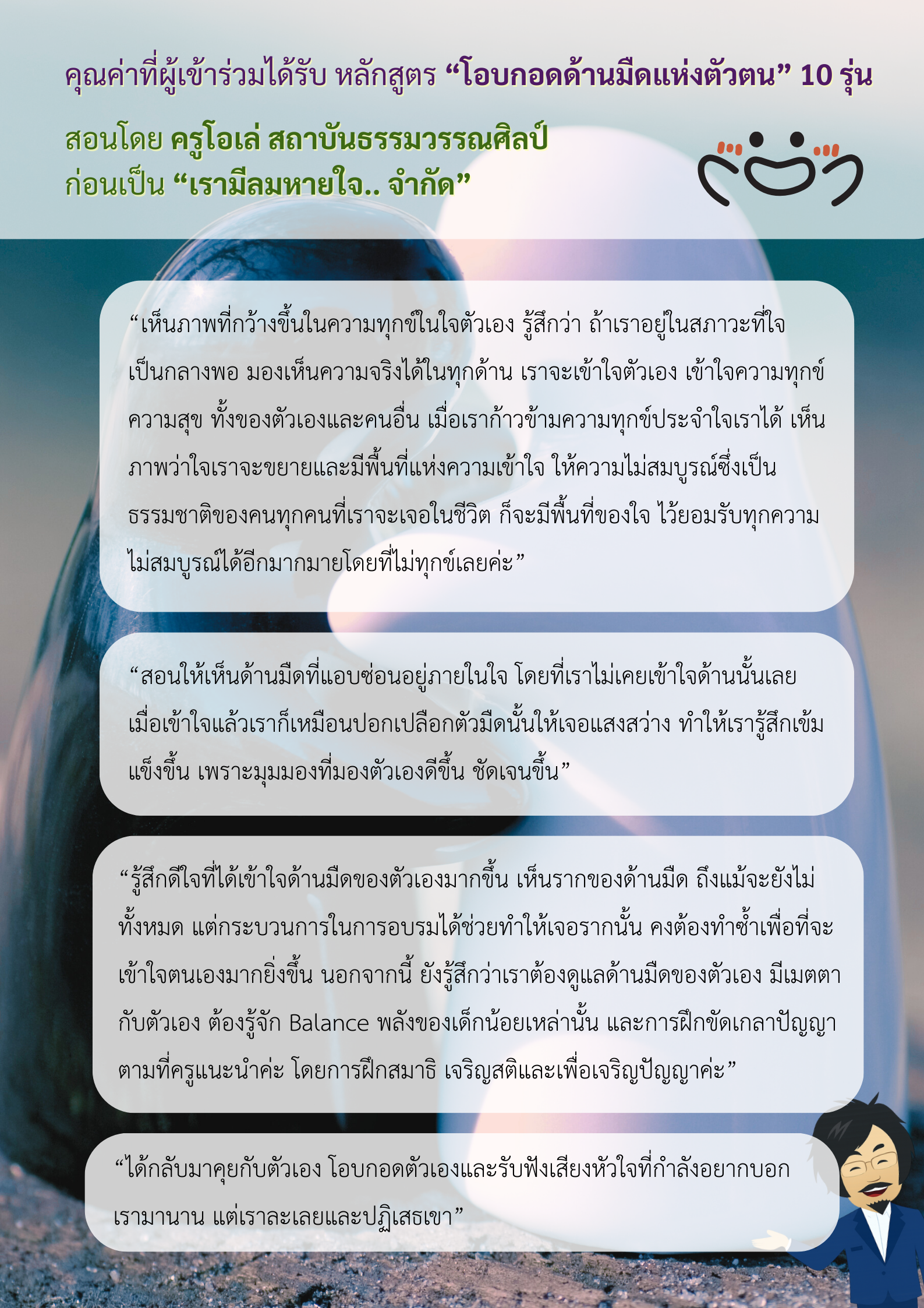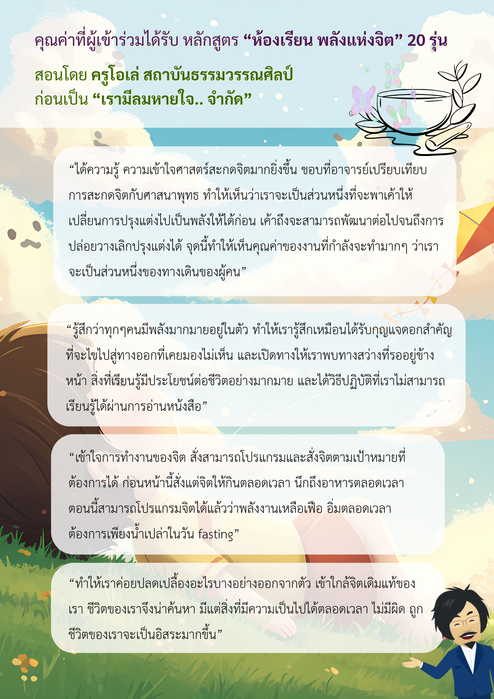 ในค่าเรียนตามบริจาคจนถึงหลักร้อยและหลักพันต้นๆ ในการส่งมอบคุณค่าของการรู้จักตน รู้จักชีวิต การพัฒนาโลกด้านใน และการตระหนักถึง “เรามีลมหายใจ.. จำกัด”