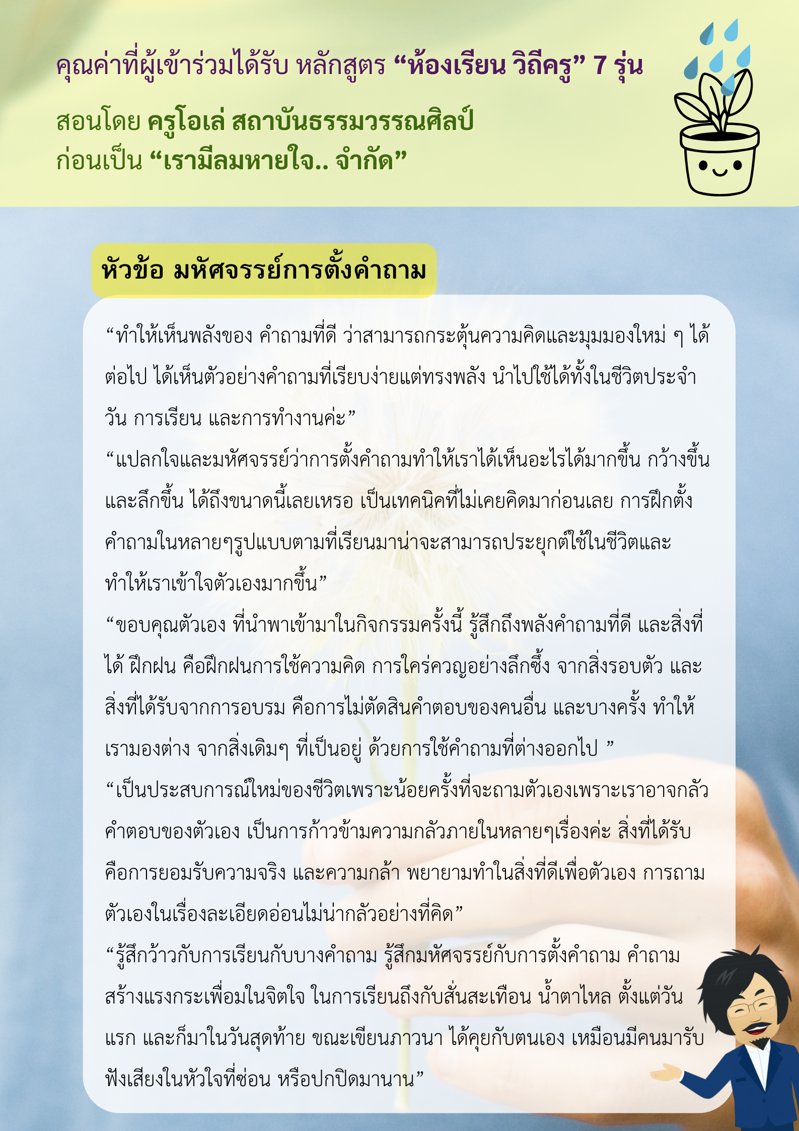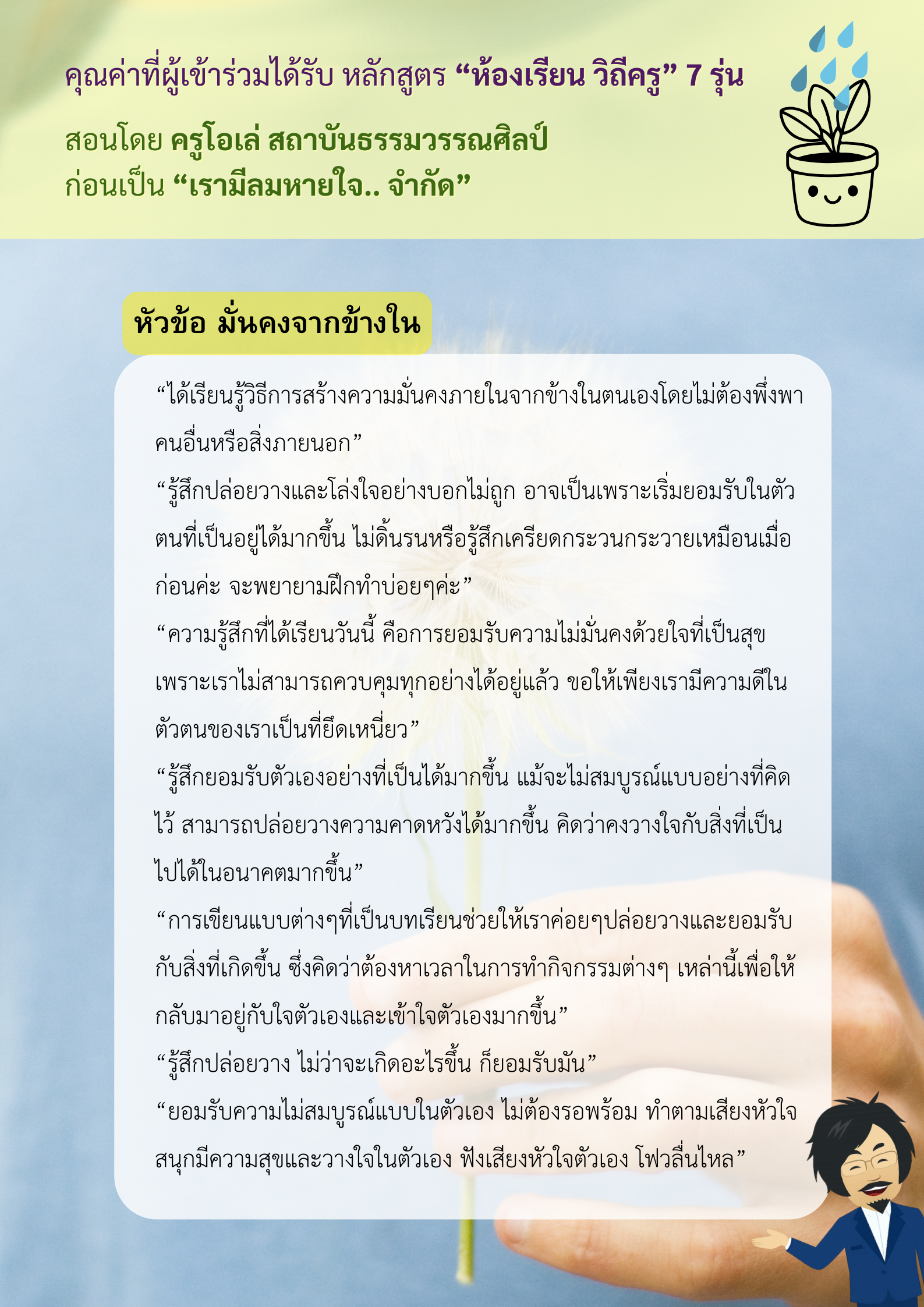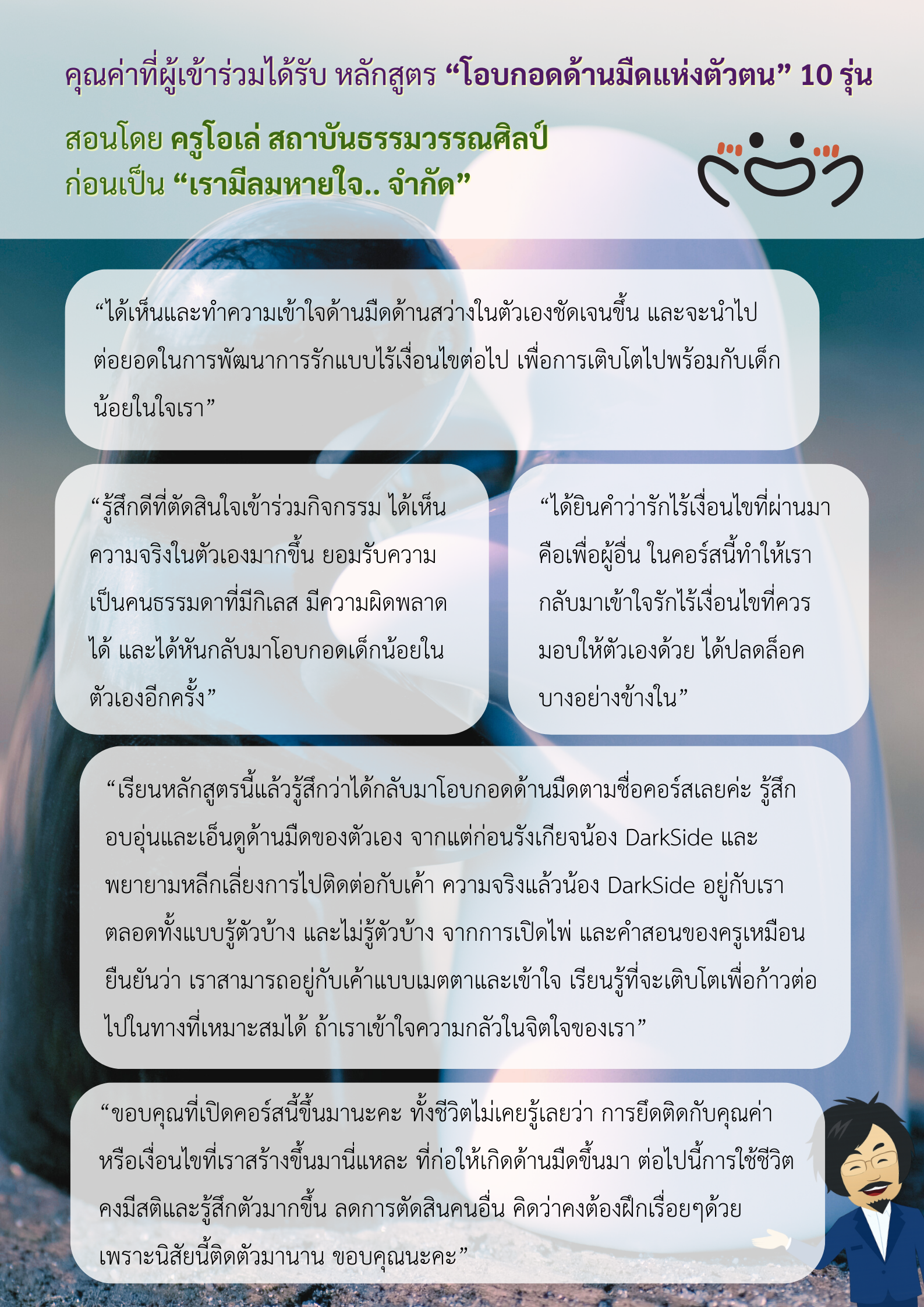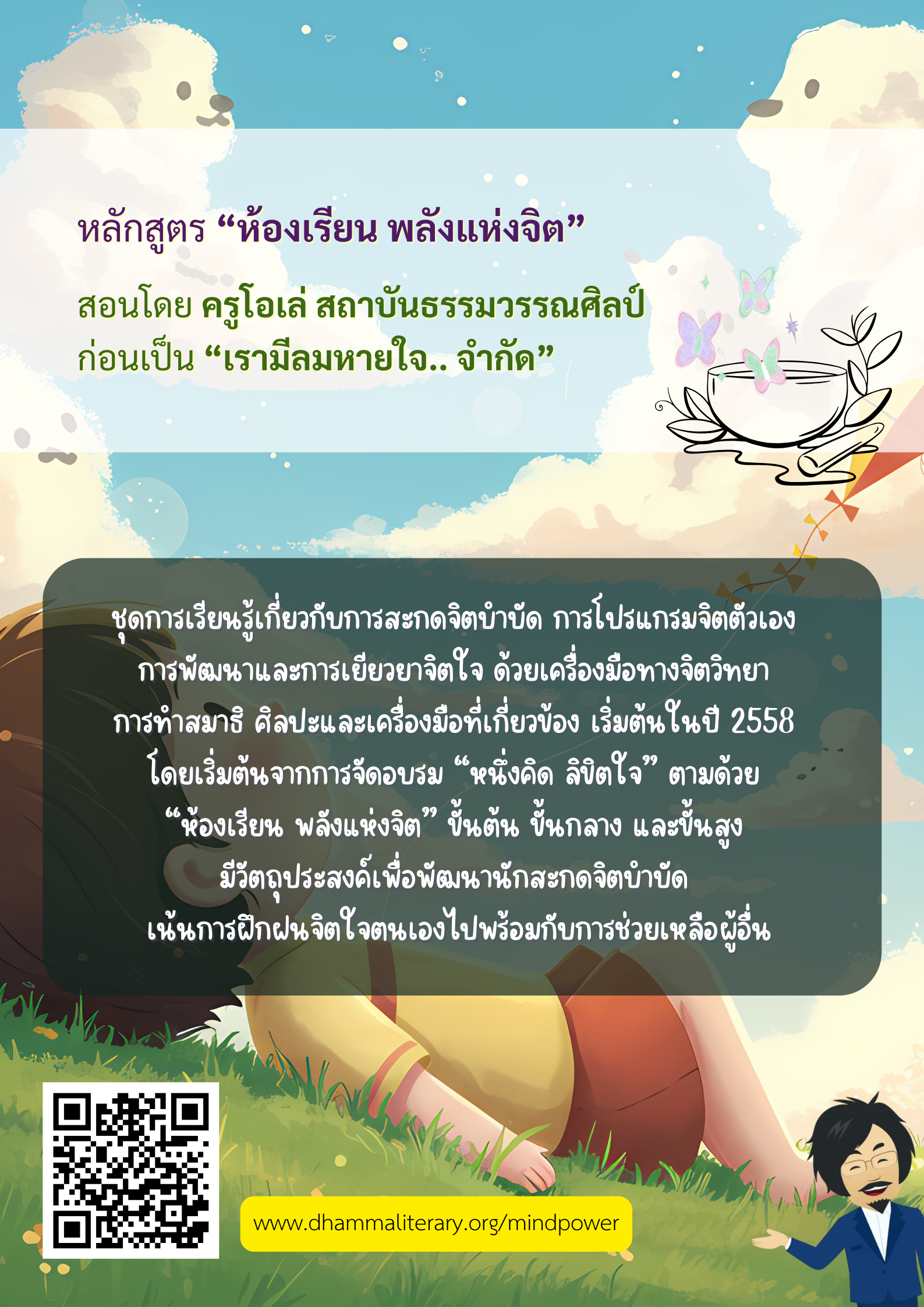ในค่าเรียนตามบริจาคจนถึงหลักร้อยและหลักพันต้นๆ ในการส่งมอบคุณค่าของการรู้จักตน รู้จักชีวิต การพัฒนาโลกด้านใน และการตระหนักถึง “เรามีลมหายใจ.. จำกัด”