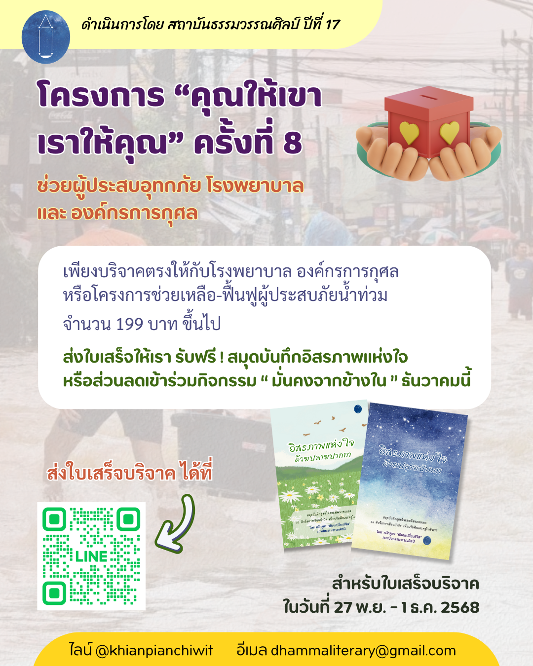 โครงการ “คุณให้เขา เราให้คุณ” ครั้งที่ 8 โดย สถาบันธรรมวรรณศิลป์ ปีที่ 17 โครงการนี้มีวัตถุประสงค์เพื่อสนับสนุนและส่งเสริมการบริจาคแก่โครงการกุศลต่างๆ ในช่วงวิกฤติ ผ่านการตอบแทนด้วยแรงจิตอาสา และการบริการจากทางเรา เริ่มต้นตั้งแต่ช่วงโควิด 19 เป็นต้นมา และโครงการได้มีส่วนร่วมสนับสนุนการบริจาคไปแล้วมากกว่าหนึ่งแสนบาท
