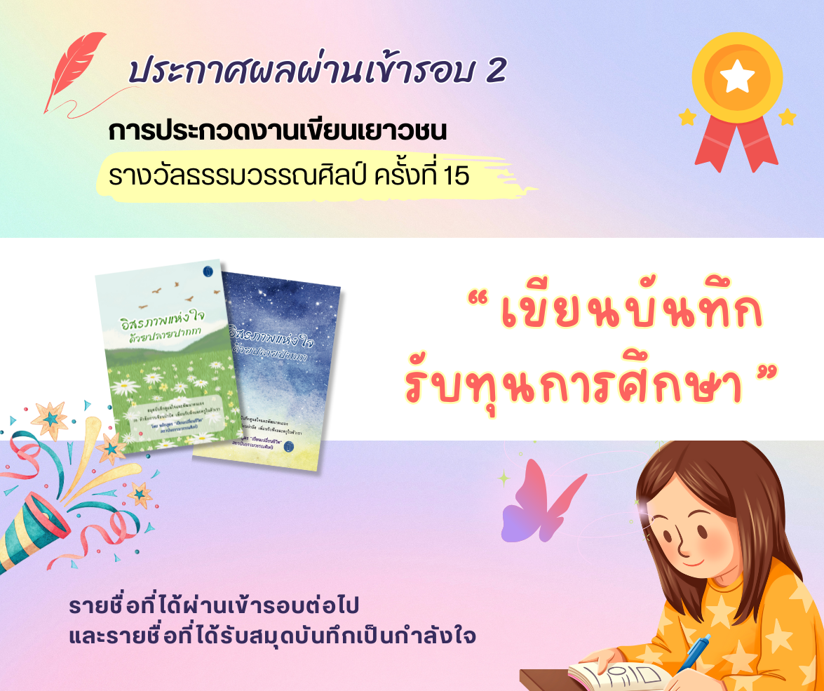 🌻น้องๆ ที่ไม่ผ่านเข้ารอบแต่ได้รับสมุดบันทึกเป็นกำลังใจจากโครงการ โปรดแจ้งที่อยู่กับทางเราเพื่อให้ทางเราได้จัดส่งสมุดบันทึกอิสรภาพแห่งใจฯ จำนวน 2 เล่มเป็นของขวัญแห่งการรักตัวเองและการฝึกฝนการเขียนต่อไป